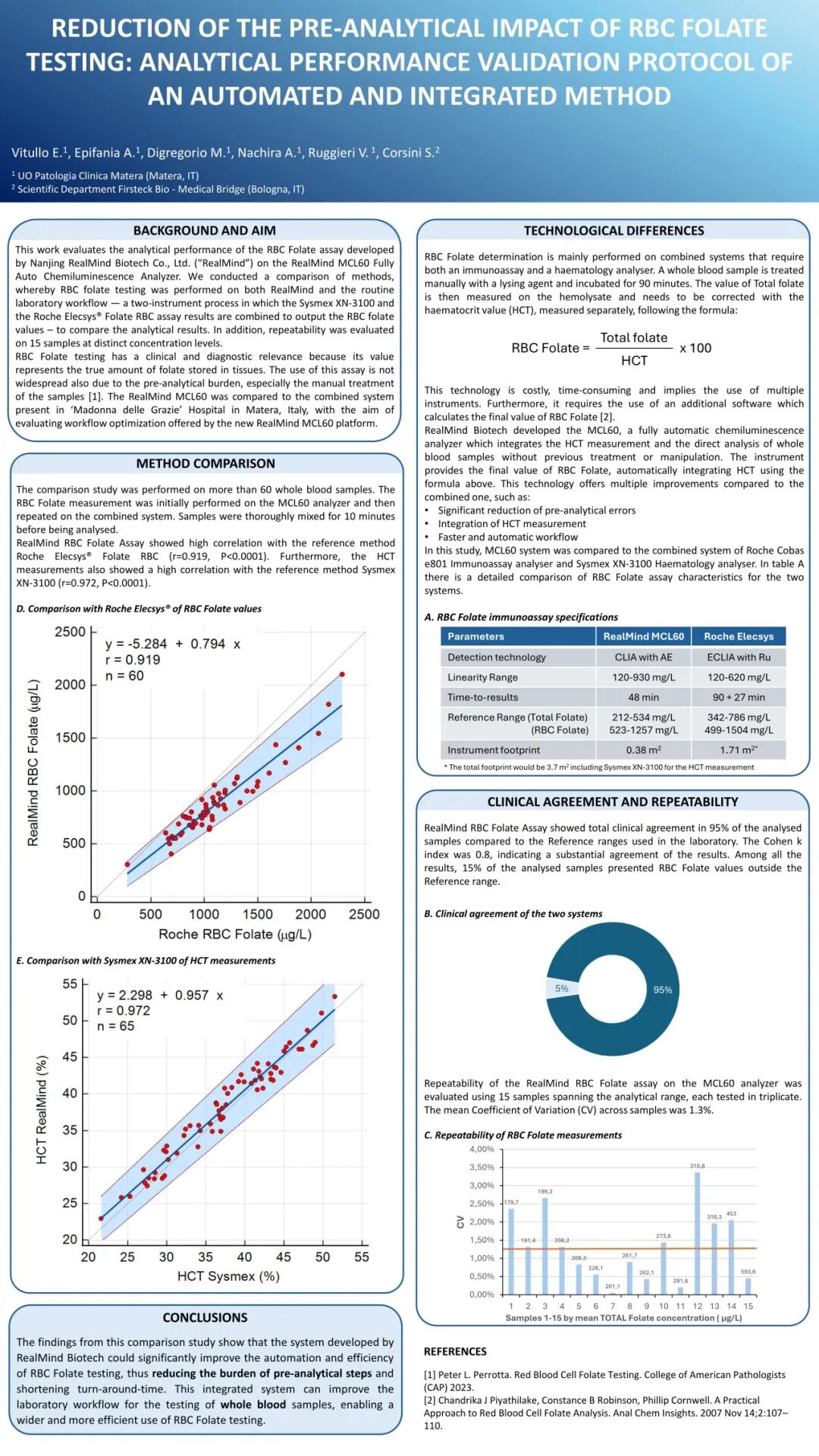 仁迈的红细胞叶酸检测法与罗氏Elecsys的红细胞叶酸检测结果呈现高度一致性。相关系数r=0.919, P<0.0001。同样,在红细胞压积(HCT)的对比中,仁迈的结果与希森美康的结果也显示出高度的相关性,r=0.972(P<0.0001)。上述结果充分说明,仁迈全过程自动红细胞叶酸检测系统具备优异的准确性。