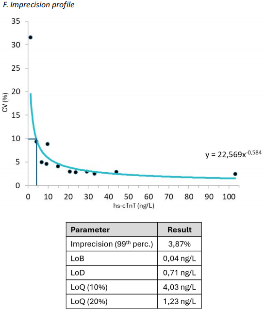 评估仁迈高敏肌钙蛋白T检测试剂盒试剂灵敏度和不精密度。曲线显示,第99百分位URL处,CV值为3.87%,符合高敏检测的要求。