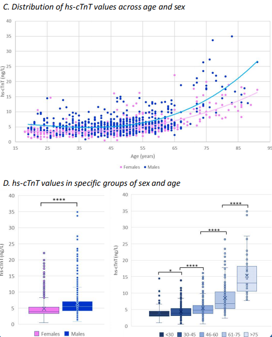 两种肌钙蛋白的数值在男性群体(P<0.0001)及老年群体中显著升高,尤其在60岁以上组别更为明显,为人群的精准诊断提供了关键依据。