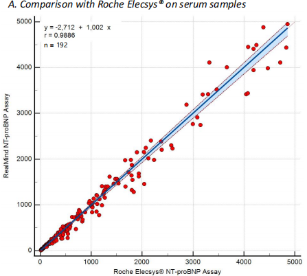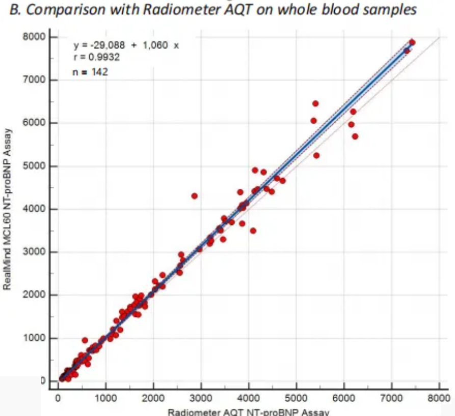 进行全血样本检测,仁迈NT-proBNP检测结果与罗氏Elecsys(r=0.9886,P<0.0001)和Radiometer AQT(r=0.9932,P<0.0001)均呈高度相关性。证明仁迈的全血NT-proBNP检测试剂有卓越的灵敏度和精密度,展现出可靠的应用性能和临床可行性。