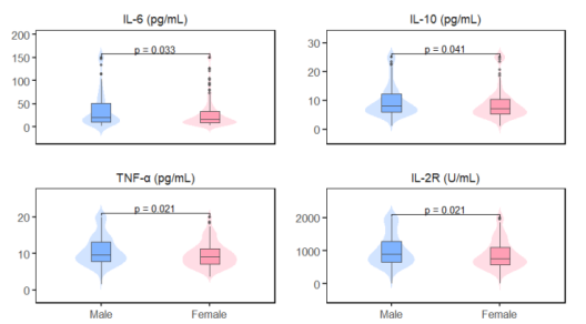 结果提示,男性的IL-6、IL-10、IL-2R和TNF-α水平均高于女性(P<0.05)。