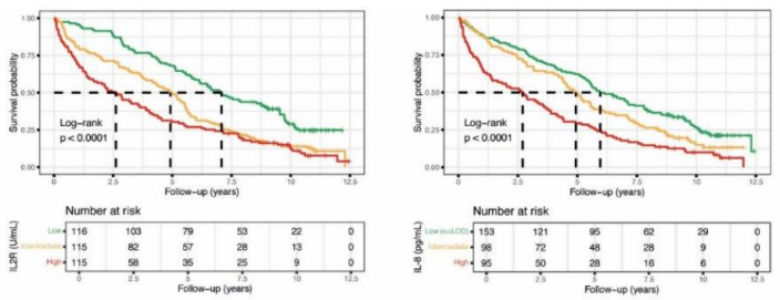 在生存分析中,IL-2R和IL-8浓度与长期死亡率显著相关,而IL-6和IL-10则不具独立预测性。