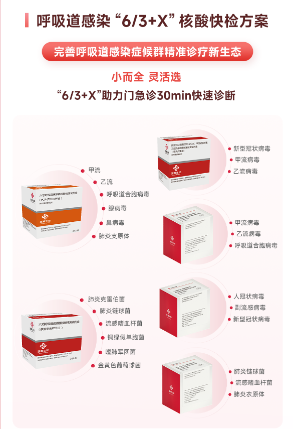 检测数量:5项 注册人:北京京东方知微生物科技有限公司 技术原理:荧光PCR法 检测靶标:甲型流感病毒、乙型流感病毒、呼吸道合胞病毒、腺病毒、肺炎支原体的核酸 样本类型:咽拭子 检测时间:<30min 注册证号:国械注准20243402481 注册时间:2024 试剂有效期:2℃~28℃避光干燥保存,有效期12个月。 (9)卡尤迪生物-呼吸道分子POCT快检方案 新型冠状病毒2019-nCoV和甲型乙型流感病毒核酸检测试剂盒(荧光PCR法) 检测数量:3项 注册人:卡尤迪生物科技宜兴有限公司 技术原理:荧光PCR法 检测靶标:新型冠状病毒(2019-nCoV)ORF1ab、N基因及甲型、乙型流感病毒(FluA、FluB) 样本类型:咽拭子 检测时间:<30min 注册证号:国械注准20233400584 注册时间:2023 试剂有效期:检测盒于2~28℃避光保存,质控品于2~8℃保存,有效期12个月。 甲型/乙型流感及呼吸道合胞病毒核酸联合检测试剂盒(实时荧光PCR法)Xpert Xpress Flu/RSV Assay 检测数量:3项 注册人:赛沛公司Cepheid 技术原理:荧光PCR法 检测靶标:甲型流感病毒/乙型流感病毒/呼吸道合胞病毒 样本类型:鼻咽拭子 检测时间:<30min 注册证号:国械注进20193400413 注册时间:2019年 试剂有效期:2~28℃储存,有效期为24个月 |