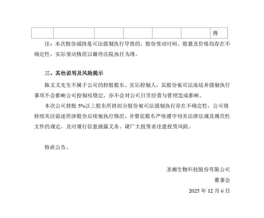 12月5日公告,圣湘生物科技股份有限公司于近日收到湖南省株洲市中级人民法院下发的(2025)湘 02 执 1204 号《协助执行通知书》,获悉公司持股 5%以上股东陈文义先生所持公司的部分股份拟被司法冻结并强制执行。陈文义先生持有公司股份32,917,370 股,占公司总股本5.68%,不属于公司的控股股东、实际控制人,其股份被司法冻结和强制执行的事项不会影响公司控制权稳定,亦不会对公司日常经营与管理造成影响。据圣湘2025年第三季报,陈文义属于第3大股东,第2大个人股东。