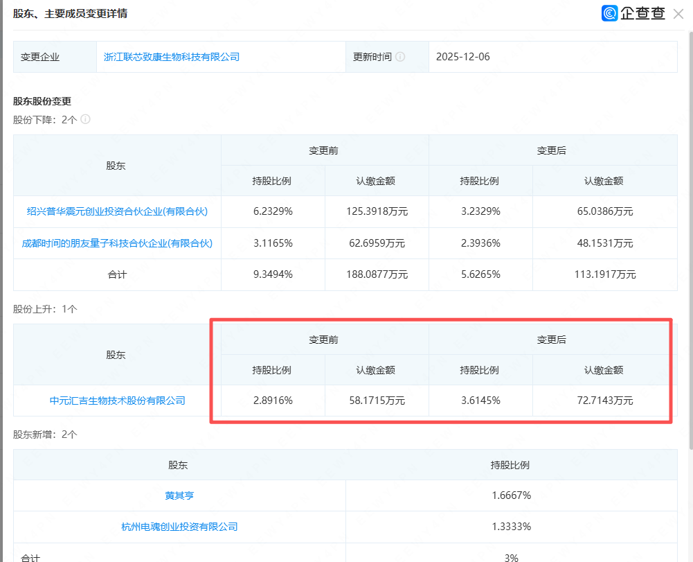 12月6日,据企查查消息,中元汇吉生物技术股份有限公司在浙江联芯致康生物科技有限公司中的持股比例自2.8916%上升至3.6145%!
