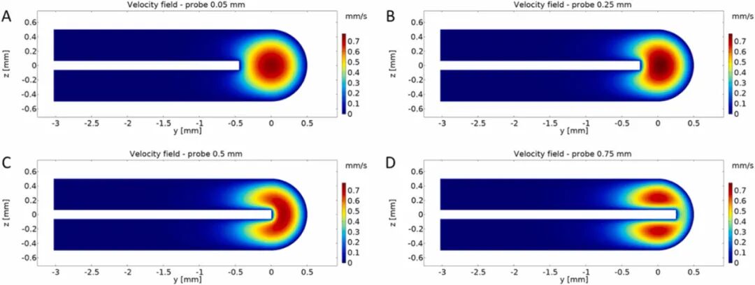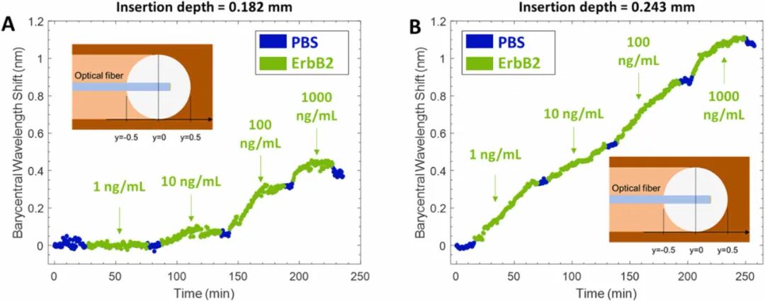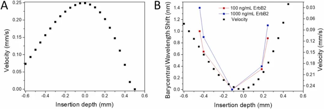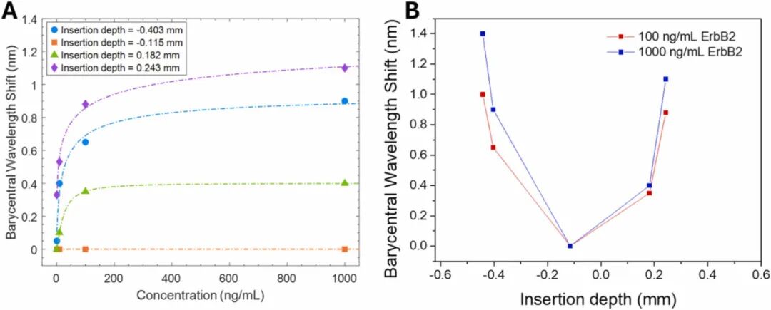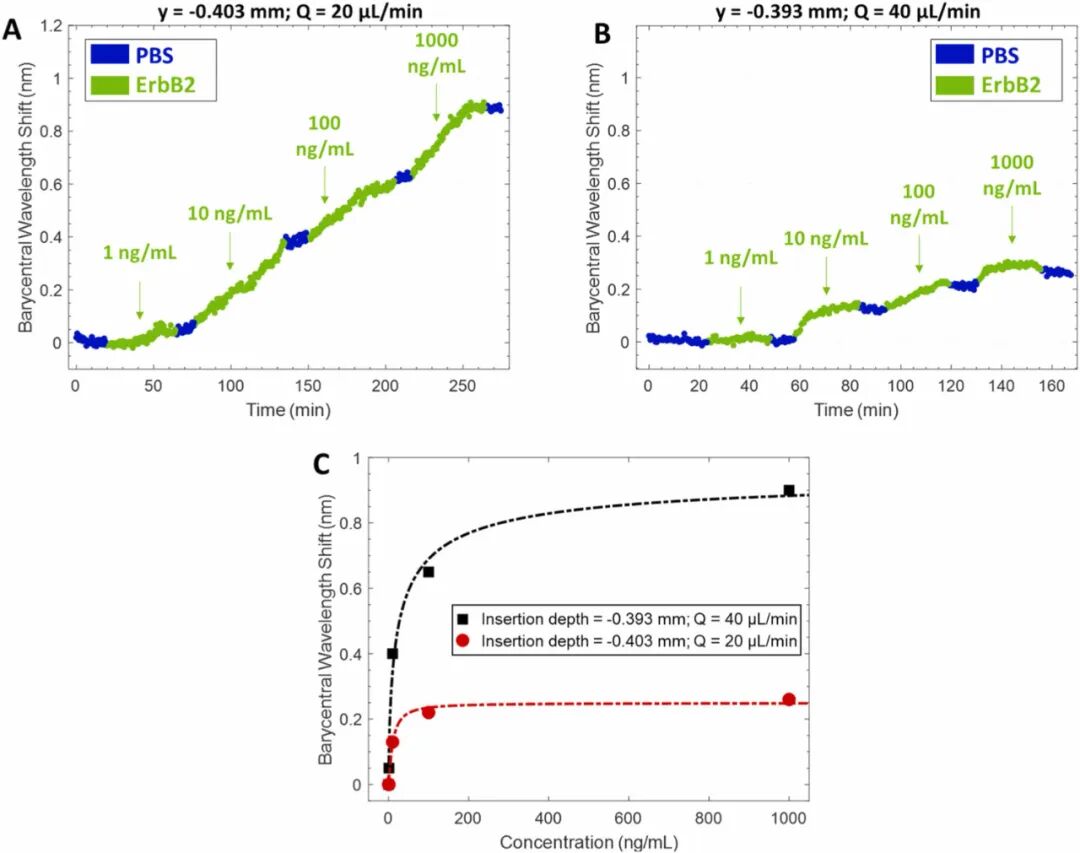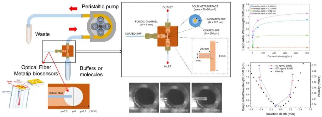 | 生物传感器在日常生活的许多领域都发挥着至关重要的作用。人体体液中蕴含的大量生物信息和诊断线索,激发了人们开发用于高通量诊断筛查的智能设备,利用液体活检来分析血液、尿液或唾液等样本。迄今为止,已开发出多种生物传感器,它们的生物检测元件和信号转导机制各不相同。其中,光纤(OF)生物传感器通过测量光与分析物相互作用时的特性变化来工作,因而具有极高的灵敏度。光纤生物传感器的主要优势包括可进行遥感、不受电磁干扰、可小型化以及实时监测,这些特性使其在各种应用中极具前景。光纤凭借尺寸小、柔韧性好、生物相容性佳以及易于集成到导管或医用针头中的固有特性,被广泛用于远程、实时、在体和微创组织成像或照明。成熟的光纤实验室(LOF)技术将微米和纳米级功能材料集成到光纤基底上,打造出一种具有特殊生物传感能力的高度通用平台,为医疗和健康技术的进一步发展提供了巨大潜力。微流控芯片为光纤传感结构提供了稳定且可控的环境,使后者仅与病变周围的液体微环境相互作用,并保护它们免受可能影响其性能的外部环境因素的影响。然而,将光纤集成到液体处理电路中以用于大规模筛查、即时诊断和在体应用仍然是一个相对未被探索的领域。已有报道的研究表明,关于尖端实验室(Lab-on-Tip)生物传感光纤探针在微流控通道中的最佳放置仍有待研究。此外,流动中光纤平台尖端的生物分子相互作用的复杂动态仍缺乏充分表征。据麦姆斯咨询介绍,意大利圣尼奥大学和萨尼奥大学的联合研究团队报道一个具有临床意义的实际案例,将等离激元超构表面增强的尖端实验室生物传感平台(OFMT)集成到T形微流控芯片中,以检测具有临床意义的靶分子——乳腺癌生物标志物受体酪氨酸蛋白激酶(ErbB2)。相关研究成果已经以“Towards microfluidics assisted optical fiber metatip biosensors”为题发表于近期的Sensors and Actuators B: Chemical期刊。研究团队使用ErbB2作为目标蛋白,以评估OFMT生物传感器的检测灵敏度。OFMT结合了光纤实验室技术与等离激元超构表面,后者可提高光操控能力和灵敏度,这代表了该领域的一项重大进展。OFMT的多功能性已被用于提高对局部折射率变化的灵敏度,能够检测生物分子相互作用,且检测限极低。此外,已有研究表明OFMT是用于检测小型生物分子和肿瘤标志物的创新型生物传感器。该系统包括一个蠕动泵、一个带有交叉1 mm通道的“T”型微流控芯片和管路。主流体经入口和出口端口流过,而正交通道则容纳光纤探针。该微流控芯片采用一体式设计,以最大限度降低组装复杂度,并防止泄漏或压力损失等问题。其中,探针未固定,便于调整位置,且测试后可重复使用。系统经功能化后,研究团队通过将OFMT放置在通道内的两个不同位置,研究了探针定位对生物传感器性能的影响。图1 利用OFMT探针在两个不同位置检测ErbB2图2 OFMT在微流控通道中的插入深度对ErbB2生物传感器响应的影响该研究探讨了探针定位和流体动力学对OFMT生物传感器检测ErbB2的性能影响。该探针用TZ抗体进行功能化,并在受控流动条件下用于微流控芯片。传感器的响应以重心波长偏移表示,在不同ErbB2浓度(1-1000 ng/mL)和通道内不同的探针位置下进行了测试。实验结果表明,探针的位置对传感器性能有显著影响。具体而言,靠近通道中心的位置导至较低的光谱变化,而探针尖端离中心越远,灵敏度越高。数值模拟证实,这些变化取决于探针敏感区域内不同的局部流速,较高的流速缩短了分子的相互作用时间,导至较低的传感器响应。实验验证还证实了流速与生物传感器灵敏度之间存在反比关系,强调了需要优化探针定位和流动条件以提高检测效率。图4 探针附近的流速与实验生物传感器对ErbB2的响应之间的关系总之,生物传感器响应对流速的依赖性是尖端实验室生物传感器开发和使用中的关键因素。该研究的主要贡献是系统评估了将光纤尖端生物传感器集成到微流控环境中所面临的关键挑战。该研究成果得出两个主要结论:(i)考虑到质量传输限制、结合动力学和传感器响应动态,定量理解了通道内的流速和光纤位置如何影响整体检测效率;(ii)详细评估表明,流体参数(如通道几何形状和流动剖面)与传感器定位本质上是相互依赖的。这些因素共同决定了传感平台的性能,在基于微流控的生物传感应用中,必须对其进行协同优化,以实现最大的灵敏度和重现性。理解并掌握这种关系将有助于开发更准确、更可靠的生物传感器,使其能够在不同的流动条件下有效工作。特别是,必须密切关注传感器探针附近的流速,以提高生物传感器的检测效率。事实上,通过调整微流控通道的尺寸,特别是探针附近的尺寸,或许可以创造局部流动条件,在不影响整体流速的情况下减缓流体速度。此外,实施流量控制机制,如引入障碍物或缩小通道部分区域,可能有助于调节探针附近的流动,从而提高检测效率。https://doi.org/10.1016/j.snb.2025.139182