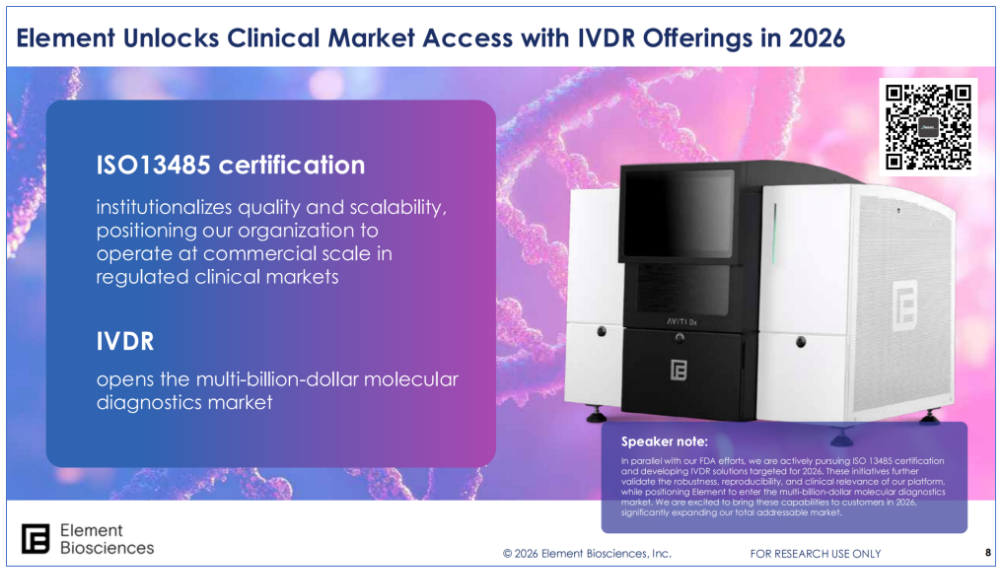 | 这次JPM2026做测序仪的 Illumina、PacBio、Element都去了,我们也都看到了他们的PPT,好评。Anyway,今天想说的是Element,这应该是我们第一次看Element的片子。第一,Element 2025营收约8500万美元,增长40%;第二,测序仪安装量突破450台,大多数集中在欧美;第三,将推出高通量桌面式测序仪,基因组测序成本预计低于100美元;喜欢看我唠叨的...我们逐个来聊下标题中的关键字。PPT在我们的JPM2026大礼包里,大家关注我们的公众号和星球,持续更新。根据GenomeWeb记者前方发回来的消息,Element的CEO、创始人Molly He表示2025年公司营收达到约8500万美元,相较于2024年增长约40%。根据PacBio在JPM2026上公开的数据,其2025年全年营收也就1.6亿美元。根据Elment公布的数字,截至2025年底已经超过450台测序仪安装,年增长率达到60%。全球超40个国家均有部署,从地图上看欧洲美国还是占大头的。2026年Element计划推出2台新测序仪,其中一台瞄准100美元基因组,并且是能够拓展到多组学应用。但是,需要注意的是,Element这个100美元基因组的前提是桌面级测序仪。从轮廓上来看,似乎是把AVITI劈了一半...不过这效果图可能就是图一乐,咱们继续关注。Element有IVD方面的布局,这个我们早就聊过。只是,在这之前,Element很少提及,我们也没有持续关注。本次JPM大会上,Molly表示将在2026年推出IVD版本的AVITI测序仪。IVD版本测序仪将同时寻求CE-IVDR和FDA监管批准。Element的Teton Atlas多组学技术已经能够做到88种蛋白+3’全转录组分析了,有点厉害。我估计,在2026年2月的“Beyond”活动中Element将披露更多信息,我们也将持续关注。先跟大家分享到这里了,有机会我们再来详细拆解其他家JPM2026上的PPT。注1:https://www.genomeweb.com/sequencing/element-biosciences-highlights-pair-forthcoming-sequencing-launches-jpm