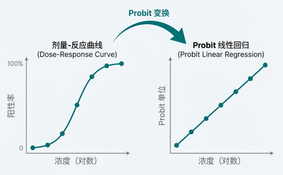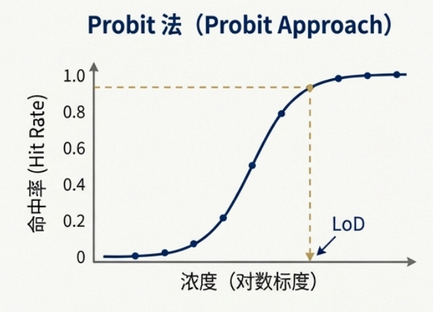 一、 核心概念1. 什么是 Probit 方法?Probit 方法(概率单位法)是一种统计回归分析技术,专门用于处理二项分布数据。在核酸检测性能评估中,它通过建立被测物浓度与检出概率(阳性阳性率)之间的函数关系,来推断出特定检出概率下的浓度阈值。 对于分子测量程序,当样本浓度极低时,结果往往不是连续的数值,而是“有”或“无”。因此,我们无法计算标准差,而是通过阳性率(Hit Rate)来衡量检测能力。 2. 关键术语定义根据 CLSI EP17-A2 标准,以下术语至关重要: 空白限 (Limit of Blank, LoB): 对于大多数分子测量程序,阴性样本的测量结果通常报告为“未检出”或零拷贝。因此,在 Probit 评估中,LoB 通常被设定为零。