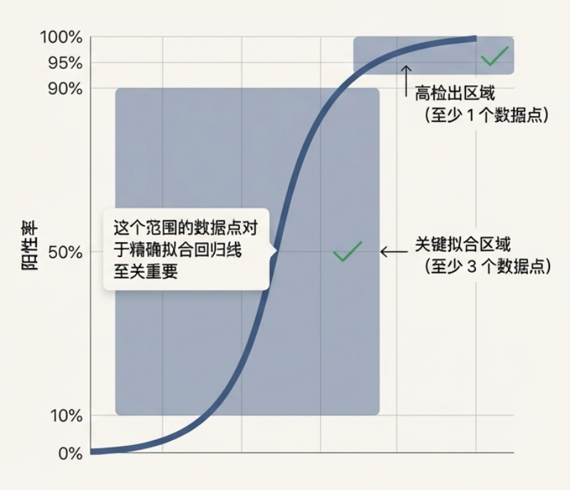 2. 关键:稀释液的分布要求 稀释梯度的设计直接决定了 Probit 回归的拟合质量。如果所有数据点都是 100% 或 0% 检出,模型将无法收敛。因此要求: 中间区间:至少有 3 个 稀释度的阳性率落在 0.10 到 0.90 之间(即 10%-90% 阳性率)。 高位区间:至少有 1 个 稀释度的阳性率 > 0.95(确保包含 LoD 附近的点)。