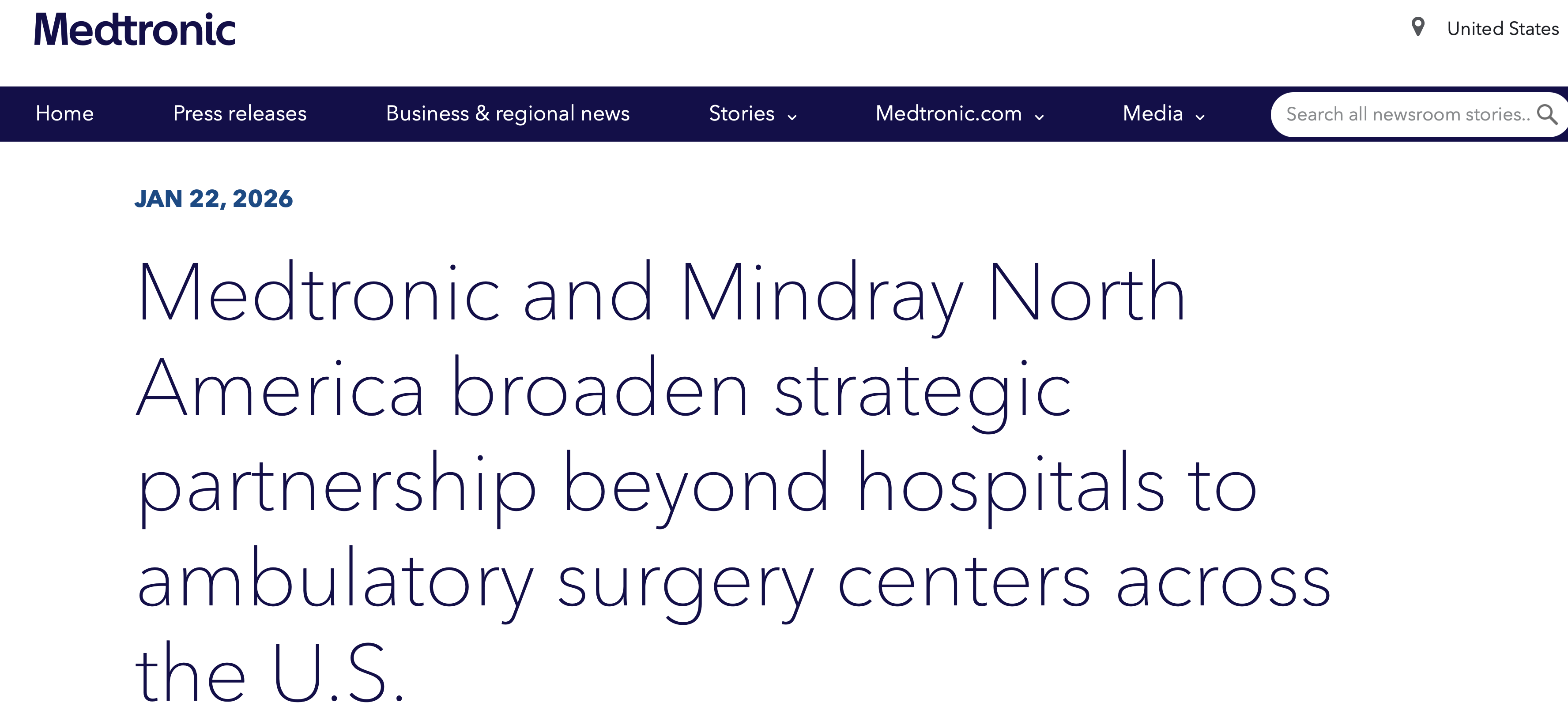 1月22日,美敦力与迈瑞宣布,将双方在患者监护技术方面的战略合作伙伴关系从医院拓展至门诊手术中心(Ambulatory Surgery Centers,ASC),进一步彰显了双方致力于为美国住院和门诊环境中的临床医生和患者提供支持的共同承诺