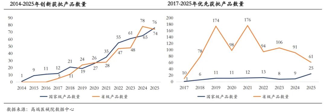 对比中美两国市场,药智医械数据显示,2025年上半年美国上市医疗器械共计2441件,其中510(k)途径获批产品占比达65.54%;同期我国获得FDA认证的医疗器械产品总数为264件,二类器械占据绝对主导地位。在创新医疗器械领域,我国进步显著,2025年进入各级创新与优先审批通道的产品数量大幅提升,商业化落地节奏持续加快,高端医疗器械领域的技术空白正加速补齐。国家药监局数据表明,“十四五”以来,我国已批准创新医疗器械292个,是“十三五”期间的3.3倍,较2014—2020年七年总量激增144%,本土企业产品占比超过80%;而2024年FDA获批上市的突破性器械产品共32款,主要集中于无源植入器械领域。