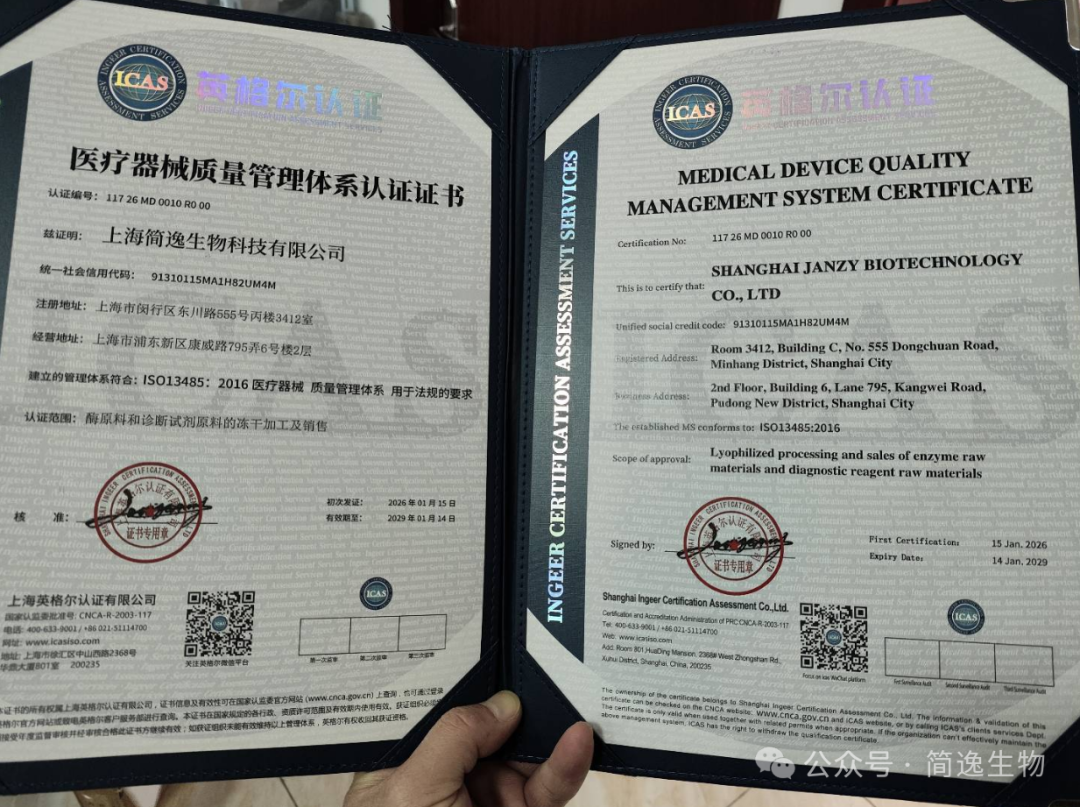 喜讯:简逸生物新生产基地已正式通过ISO 13485医疗器械质量管理体系认证,标志着我们的冻干试剂生产迈入合规化、规模化、体系化的全新阶段。 核心数据见证实力:
