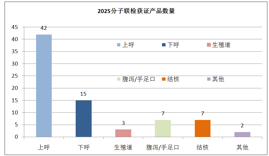 2025年感染类分子联检产品获证数量。上呼吸道分子联检类产品获证42款排名第一,下呼吸道、腹泻/手足口、结核、生殖道感染位列二至五位。(统计为大浩人工收集信息,若有遗漏欢迎补充)。