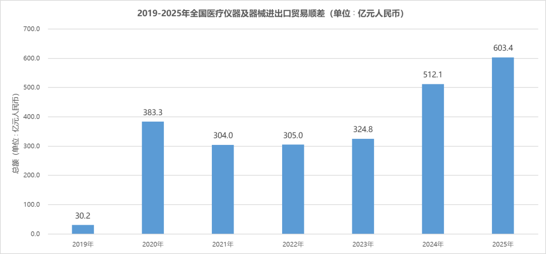1)出口:7年增长68%,国产医疗仪器及器械畅销全球 中国医疗器械出口呈现持续高速增长态势,仅2022年小幅回调。从2019年的 890.1亿元稳步攀升,2024年成功突破1400亿大关,2025年再创新高逼近1500 亿,达到1495.3亿元,7年累计增长约68%。这一亮眼成绩不仅彰显了国内医疗器械产业的国际竞争力持续提升,更印证了全球市场对中国医疗设备的旺盛需求。 2)进口:先增后稳 呈现“先增后稳”的波动特征。2019-2021年从859.9亿元增长至峰值1005.7亿元,2022年后回落并维持在900亿元左右(2022-2025年在890-970亿元区间波动)。这一变化可能与国产高端医疗设备的替代能力提升、国内需求结构调整有关。 二、顺差突破 600 亿(出口-进口),出口主导贸易新生态 |