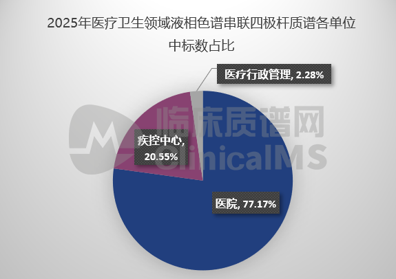按采购单位类型划分,医院系统占据绝对主导地位且增速迅猛:2025年医院系统招标量约169台,占比77.17%;疾控中心招标量约45台,占比20.55%;医疗行政管理单位占比2.28%。 2025医疗卫生领域各单位LC-MS/MS中标数量占比, 临床质谱网制图
