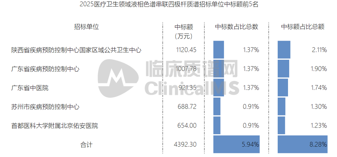2025年医疗卫生领域液相色谱串联质谱(LC-MS/MS)采购市场持续扩容,核心指标均实现大幅增长:采购单位达196家,采购仪器219台,中标总金额约5.3亿元。同比2024年,实现量额高速增长。这也印证了临床质谱在疾病诊断、公共卫生监测等领域的应用需求持续释放。 从头部采购力量来看,陕西省疾病预防控制中心国家区域公共卫生中心、广东省疾病预防控制中心、广东省中医院、苏州市疾病预防控制中心、首都医科大学附属北京佑安医院跻身招标金额前五。这五家单位合计招标量占总量的5.94%,招标额达0.44亿元,占总金额的8.28%,凸显了区域公共卫生中心与大型三甲医院作为核心采购主体的引领作用。 2025医疗卫生领域LC-MS/MS中标前五名的单位, 临床质谱网制图