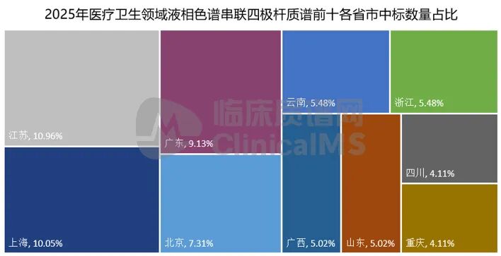 省份层面,采购量前十的省份为江苏、上海、广东、北京、云南、广西、浙江、山东、重庆、四川,合计占全国总量的66.67%。前十省份覆盖三大核心区域,且南方省份占据主导,进一步印证了我国临床质谱市场需求的区域集中度与经济医疗发展水平的强关联性。 医疗卫生领域LC-MS/MS 2025招中标数量前十的省份,临床质谱网制图