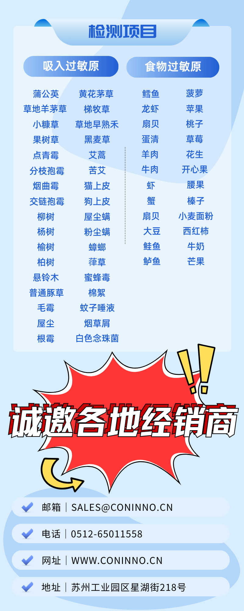 康医诺公司作为过敏原快检筛查领域的破局者,给广大易敏人群带来方便、快速、高通量的过敏原检测方案,现诚邀各医药经销商、IVD企业等志同道合的伙伴们,与康医诺共建过敏原快检产品销售渠道,共绘过敏早筛蓝图。