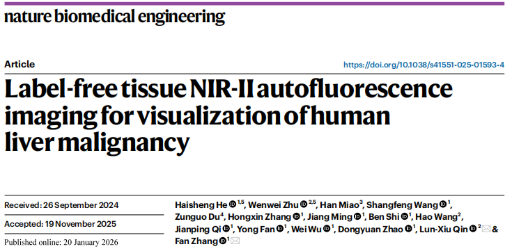 近日,一组来自复旦大学及其他顶尖机构合作在杂志Nature Biomedical Engineering上发表了一篇题为“Label-free tissue NIR-II autofluorescence imaging for visualization of human liver malignancy”的文章。作者研究并开发了一种新型的无标记、宽视野实时成像技术,名为‌组织自体荧光第二近红外窗口成像(TANI)‌,用于在肝切除术中实时、准确地可视化并区分各种肝脏恶性肿瘤与正常或良性病变组织。TANI 能够在各种肝癌的等级、阶段和病理类型中提供显著的成像对比度、诊断特异性和敏感性,不受肝硬化的影响,使外科医生能够轻松且清晰地辨别癌性病变的边界。