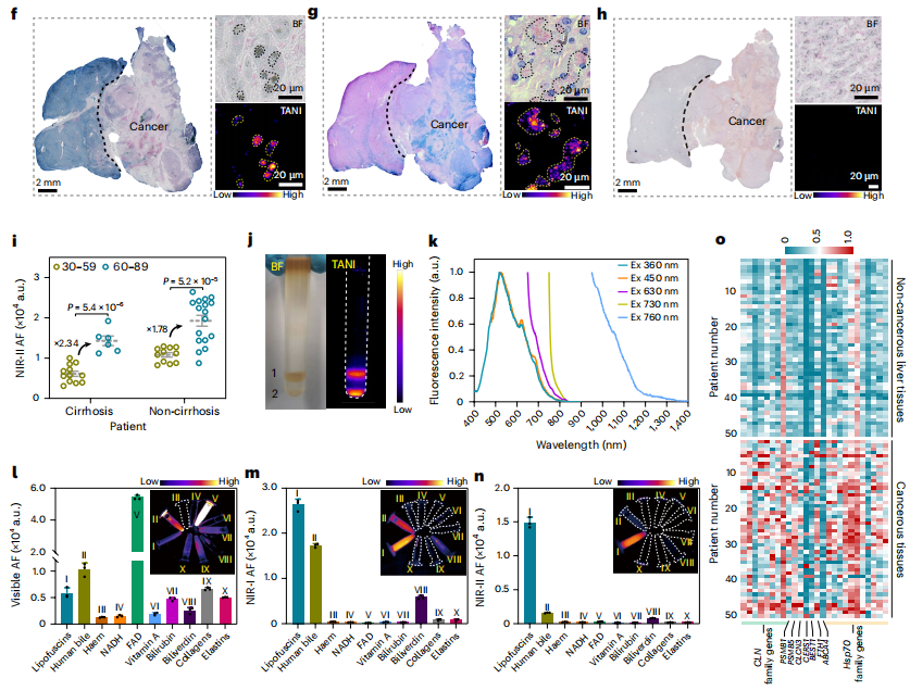 作者通过显微镜检查、组织化学染色和透射电镜分析,推测这些NIR-II自体荧光颗粒是‌脂褐素样物质(图 f-h)‌。脂褐素是细胞代谢过程中积累在溶酶体内的不可降解色素颗粒。脂褐素在正常肝细胞的肝实质中大量存在。而由于癌细胞增殖速度快,细胞分裂导至胞内脂褐素浓度被稀释。同时,癌细胞中一系列与溶酶体功能、细胞铁稳态和脂质稳态相关的基因(如CLN家族基因、Hsp70家族基因)表达上调,也可能阻碍了脂褐素的形成(图 o)。因此,癌组织中脂褐素样物质的含量显著降低,导至其NIR-II荧光信号微弱。