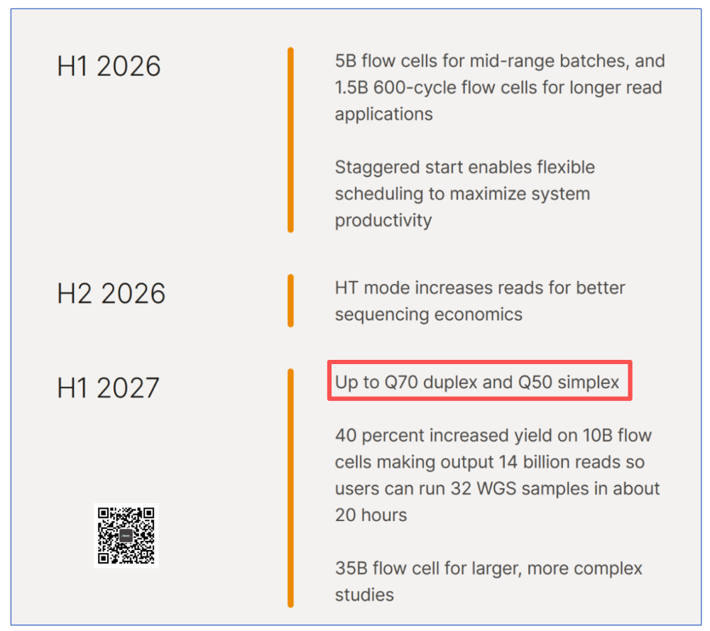 | 先是Element推出新测序仪,然后是华大智造在北美玩出花。2026年2月23日,Illumina发布重磅公告。通量提升40%至350亿条reads、Q70质量分数、缩短周转时间以及错峰启动功能。你没看错,Q70,1/10,000,000的错误率(看到最后,有反转)!其实不一定,这才刚宣布收购没多久,Onso的SBB技术与SBS差异较大,且与新升级的速度提升相悖。因此,这更像是Illumina SBS测序化学的一次重大升级。第三,测序速度从25小时提升到20~22小时是指14B(原来的10B)芯片;错峰启动功能(staggered starts )和新FC(Flow-cell)将在未来几周内向所有客户开放,话说你这Staggered starts 不会就是国内公司玩烂了的“灵活上机(滚动上机)”,也就是我们经常说的“异步”运行模式吧?热知识:NovaSeq X已经上市3年了...3年了啊~~~~你特么是生产工具啊...Anyway,不管如何,Illumina先是把“卫星”放了出来。现在Illumina能掏出来的只有新的FC和所谓的错峰启动功能,其他的...尼玛...2027年Q70,还是duplex...simplex Q50...不用说Element了,simplex的Q50咱国内的华大智造、真迈早就实现了好吗...最后我想说的是,国内NGS测序仪厂商的宣传还是不够大胆啊。注1:https://investor.illumina.com/news/press-release-details/2026/Illumina-unveils-roadmap-of-groundbreaking-NovaSeq-X-advancements-in-data-quality-output-speed-and-flexibility/default.aspx注2:https://mp.weixin.qq.com/s/RbusbaOfxFnpSb9kSJSXdA
