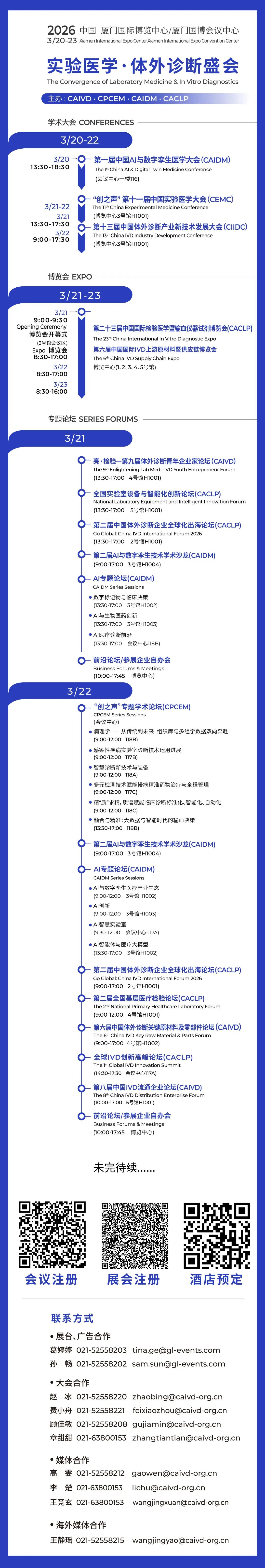 由智奥瑞和(上海)展览有限公司主办的第二十三届中国国际检验医学暨输血仪器试剂博览会、第六届中国国际IVD上游原材料暨供应链博览会(CACLP)将于2026年3月21日至23日在厦门国际博览中心隆重举行。届时,多场前沿论坛及企业自办会也将同期举办。