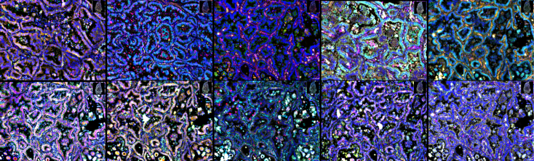 肺腺癌(左)与扁桃体(右)FFPE样本多重染色结果 100plex超高重染色,分组展示结果(扁桃体FFPE样本) 100plex超高重染色,分组展示结果(肺腺癌FFPE样本) 单次实验,全景解析——让研究者在一张切片上,同时获得肿瘤身份、免疫全景、微环境特征、治疗靶点、耐药机制等多维度信息,并保留所有信息的原始空间位置关系。 华大智造高级副总裁杨梦博士表示:“病理学已迈入多模态信息融合的加速轨道。在AI技术的驱动下,超多靶标的精细化应用正成为现实,让空间标志物的潜力得以充分释放,从而深度赋能临床诊断、预后和预测的精准化。华大智造始终秉持“生命科学核心工具缔造者”的使命,致力于打造能够高效解码生命多组学的智能工具,推动行业全面进入智能化、全景化的普惠新时代。” PMIF-20RS是华大智造推出的全流程空间蛋白组学解决方案,优势在于:染色技术温和,高效实现百重检测,智能驱动数据洞察——它为解码肿瘤免疫微环境、绘制神经环路图谱、解析发育与疾病时空动态提供了前所未有的工具支撑,正驱动病理学从平面形态观察迈向空间精准解析的新时代,为精准医学与转化研究注入核心动能。