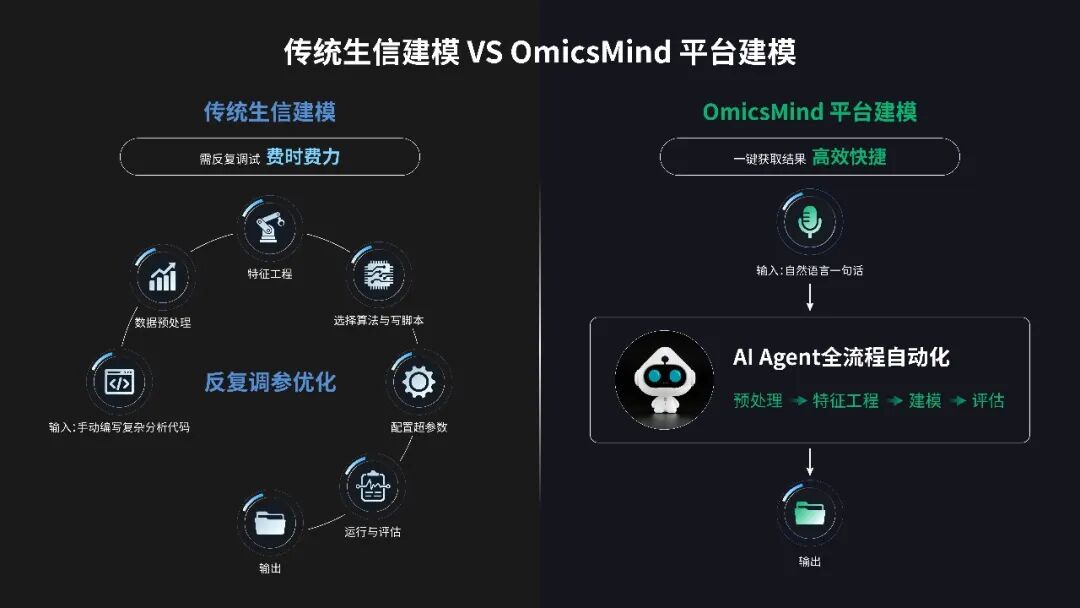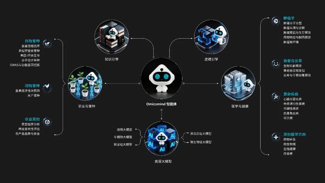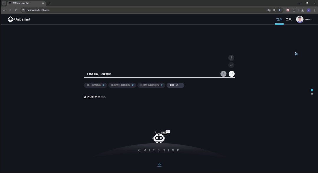 亮点1:智能数据预处理:一键上传,全程自动化质控 无需编写一行代码,只需简单上传你的组学数据(基因组、转录组、蛋白质组等均可),系统将自动识别数据类型、特征维度,智能匹配最优预处理流程,让数据质控不再是 “技术活”: ↔左右滑动查看更多 亮点2:生信专属算法库:覆盖多场景,按需灵活调用 平台集成了 20 + 种深度优化的机器学习算法,每一款都针对组学数据的高维、高噪声、强关联特性进行适配,从初步探索到深度挖掘,再到临床验证,全流程满足你的研究需求。 ↔左右滑动查看更多 亮点3:一体化智能体验:懂生信的 “科研助手”,降低 90% 使用门槛 Omicsmind 不止是工具的堆砌,更是能理解生信科研逻辑的智能系统,让不同基础的科研人都能轻松上手! RAG 知识增强:生信专业问题,秒获精准权威解答 智能对话预处理:自然语言搞定数据质控 智能对话建模:一句话启动模型训练 可视化分析平台:低代码的图形化操控界面 模型评估可视化:一键输出论文级结果 展望未来,Omicsmind除了赋能科研分析,将覆盖从农业育种、医学健康到更多前沿生命科学领域。
