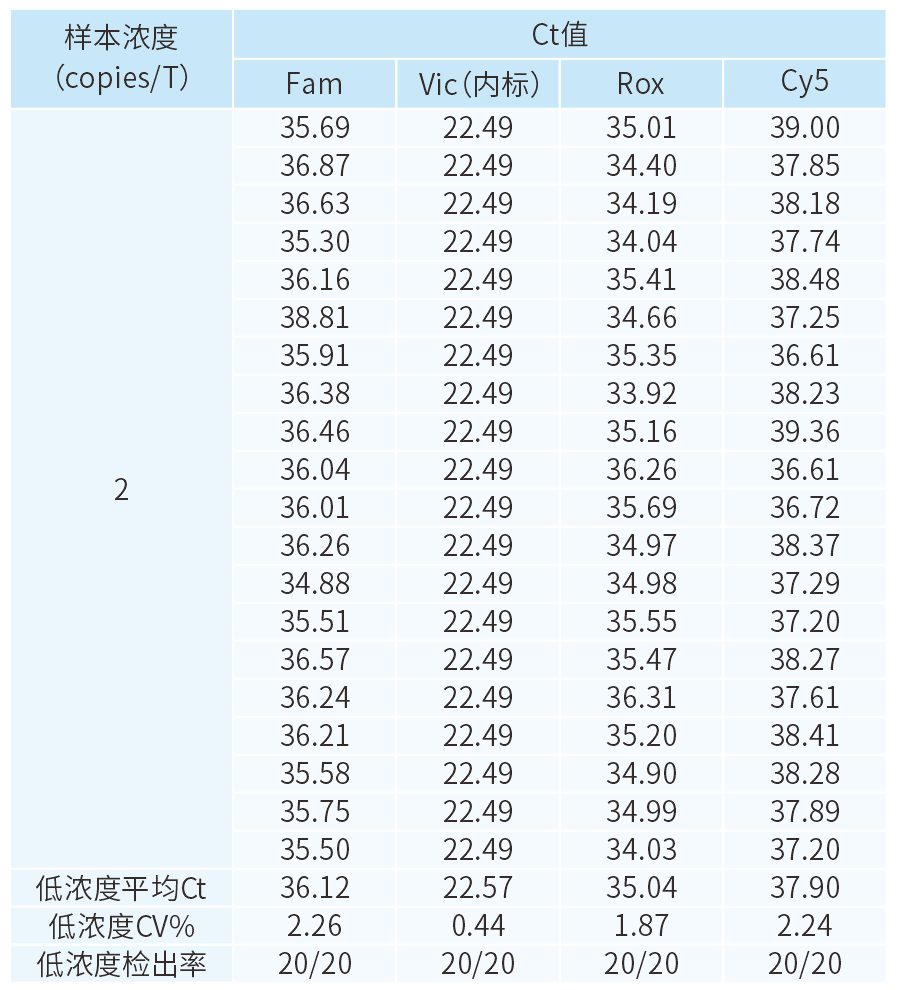 呼吸道四重检测体系下,MD2104-X体系对极限浓度样本均能全检20/20,且各通道CV值均小于3%,灵敏度和精密度表现良好。