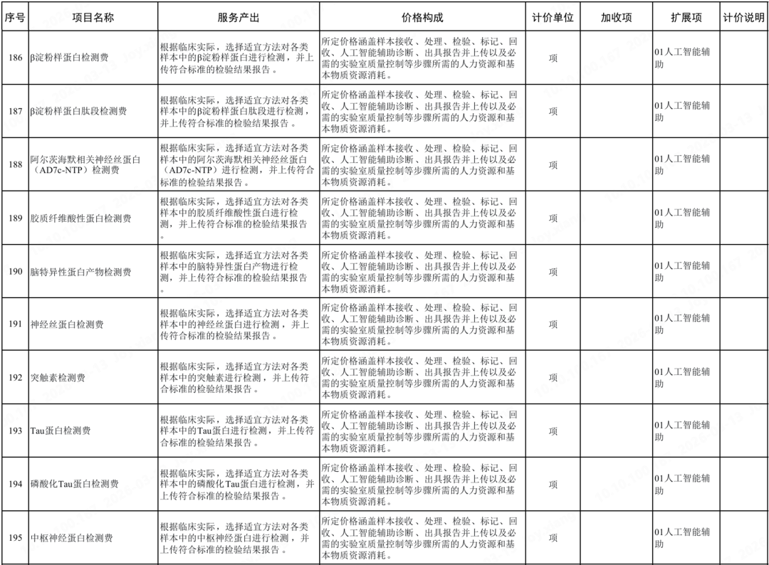 指南明确,医疗服务价格项目的核心对象不再是某一种具体检测技术,而是 “检测指标本身” 。在这一框架下,β淀粉样蛋白、Tau蛋白、GFAP、NFL等10项AD核心标志物被系统纳入国家价格项目体系(第186–195项)。