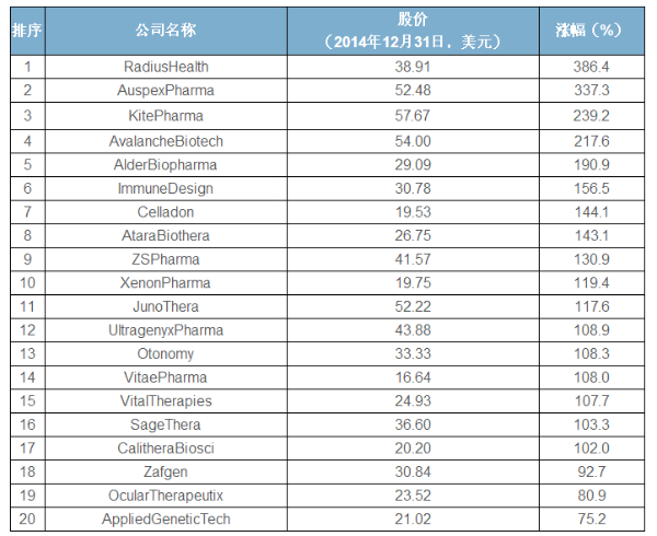 2014年,生物技术公司不仅是IPO数量令人瞩目,成功上市的公司在股市上的表现也非常抢眼,很多公司都占据了“华尔街宠儿”排行榜前10 的位置。汤森路透qixiaBioWorld根据2014年上市的生物技术公司的股价表现情况,列出了一份20强榜单。其中,截至2014年12月31日,有17家公司的股价较发行价翻了一倍。 此外,在美国上市的77家生物技术公司中,60%的公司去年的业绩乐观,从而带领整个板块达到了全年37%的涨幅,这样的局面也将鼓励更多的生物技术企业试水IPO。 股价涨幅超300% 当然,生物技术公司的上市之路并非都一帆风顺。马萨诸塞州的Radius健康公司就尝试了两次IPO,终于以每股8美元的价格,公开发行了650万股,总价值达到5200万美元。 事实上,早在2012年Radius就曾发起过一次IPO,但不如人意的市场行情令其折戟。当时,Radius打算通过募集资金完成一个风湿性关节炎治疗药物abaloparatide-SC的Ⅲ期临床试验,该药是一种甲状旁腺激素相关蛋白的合成肽类似物,该公司希望这个药物上市以后可以和礼来的“重磅炸弹”特立帕肽(Forteo)竞争市场。 如今,Radius又朝这一愿望迈进了一步。2014年圣诞假期前,Radius宣布abaloparatide-SCⅢ期临床试验到达了预期终点。这个消息足以让其成为2014年IPO生物技术公司的中的佼佼者,截至2014年12月31日,Radius股价较IPO时大涨386%,在股票表现Top 20榜中夺得头名。 根据试验结果,abaloparatide-SC组的椎体骨折事件的发生率较安慰剂组显着降低83%(p<0.0001),且与同类药物对照的、开放标签的比较试验中,得到的数据更加理想。相比于对照药物Forteo,abaloparatide-SC 能够使骨折发生率降低78%。 Forteo是目前市场上唯一一个通过影响合成代谢来治疗骨质疏松症的药物,2013年销售额超过12亿美元。而abaloparatide- SC能够更大程度地降低骨折的发生率,更好地维持患者的骨密度,且副作用更小,这些都将成为该药上市后的亮点和卖点。 此外,还有91%的患者在参与Ⅲ期临床试验后又参与了后期的继续观察试验,这将有助于在未来24个月的时间内继续观察患者骨折发生率的降低程度。 与Radius类似,Ⅲ期试验正向结果也拉高了Auspex公司的股价。截至2014年12月31日,Auspex公司的股价较IPO时大涨337%,这个成绩令其在股票表现Top 20榜中位列第二。该公司开发了一种治疗亨廷顿氏病的药物Sd-809。 Auspex公司表示,从一个名为“First-hd”的试验公布的Ⅲ期试验数据看,Sd-809达到了治疗亨廷顿氏舞蹈病的预期终点,对一些无法控制的异常行为也有一定的治疗效果。 该公司还在继续开发Sd-809用于治疗其他类型的行为失控,一个迟发性运动障碍的关键试验正在进行中,同时还在探索该药是否能用于抽动秽语综合征的治疗,该适应症30年来都没有药物被批准。 CAR-T研究受热捧 在榜单上排名第三的凯德药业(Kite Pharma),IPO时总共募集了1.46亿美元的资金。 该公司的产品主要是自体免疫细胞修饰疗法(CAR-T),通过修饰患者体内的T细胞,使其能够针对不同的疾病靶点,识别并摧毁癌细胞。凯德药业打算利用IPO募集到的资金开展在研药物KTE-C19的Ⅰ期和Ⅱ期临床试验,该药是一种通过修饰患者T细胞来治疗复发或难治性弥漫性大B细胞淋巴瘤(DLBCL)的疗法。 投资者对这种疗法热情高涨,因此凯德药业不仅IPO募集的资金数量非常可观,而且股票也在上市后大涨。尤其是在2014年末还能这样,表现十分亮眼。近日,凯德药业对外宣称已经向FDA提交了KTE-C19的Ⅰ/Ⅱ期临床试验申请。 另一家股价表现出色的CAR-T疗法研究公司Juno Therapeutics,以24美元每股的价格发行了1100万股,总募集资金达到2.64亿美元,成为美国15年来IPO规模最大的生物技术公司。 Juno也得到了市场的热烈欢迎,交易达成当日股价就上涨了45.8%,截至2014年12月31日,其股价上涨了117%。Juno公司开发的是针对CD19靶点的产品,目前已经进行到Ⅰ/Ⅱ期临床试验。 Juno的人体试验都在美国的三个不同的顶级癌症研究中心中开展,分别是西雅图的弗雷德?哈钦森癌症研究中心、纽约纪念斯隆 - 凯特琳癌症中心和西雅图儿童研究所,这些重量级后盾将会带领Juno公司一直行走在正确的产品开发轨道上。去年8月,该公司在B轮融资中也募集了1.34亿美元的资金用于癌症免疫疗法的相关研究。 根据Juno公司的计划,2015年年底前将会开始上述在研药物的Ⅱ期临床试验,希望通过Ⅱ期试验得到的数据来加速FDA的上市审批,使该药能够尽快用于治疗复发难治性B细胞急性淋巴细胞白血病。此外,Ⅰ/Ⅱ期试验中还开展了该药针对非霍奇金性淋巴瘤的临床研究。