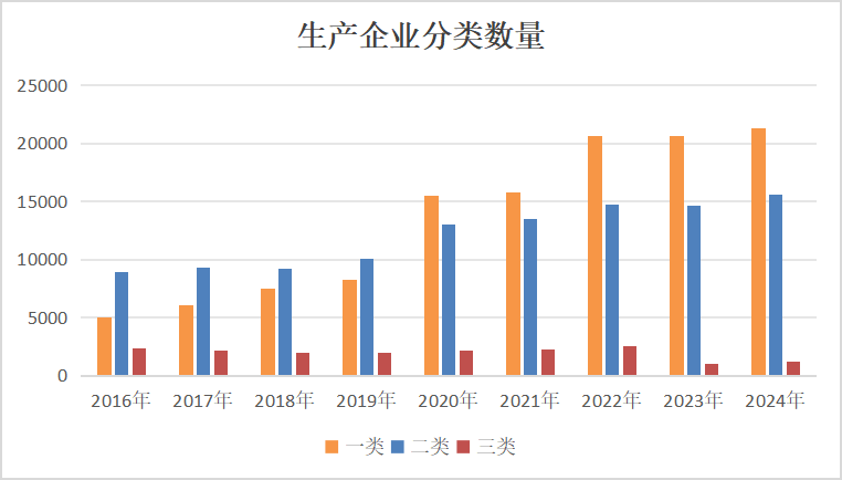 2.二类医疗器械企业受市场需求增长、技术创新推动、政策支持引导等因素影响,生产企业数量稳步上升,2016-2024年整体规模不断扩大,虽增长速度较一类企业稍缓,但成为行业创新与规模发展的中坚力量。