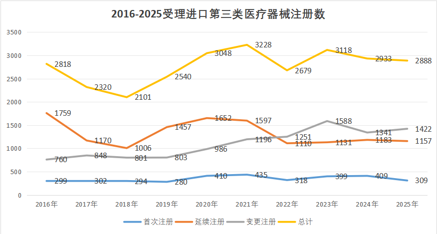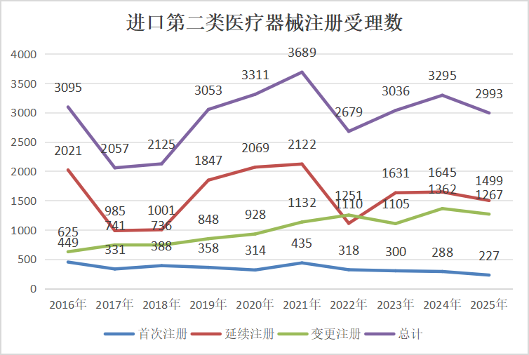 2016-2025年受理注册数量整体呈波动增长态势,首次注册、延续注册、变更注册均保持一定规模,成为进口注册的核心品类。
