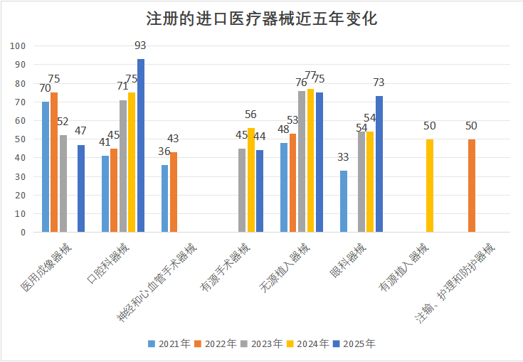 传统优势品类如无源植入器械、医用成像器械、口腔科器械仍占据进口主导地位,但部分品类受国内产业崛起冲击显著;高端品类如眼科器械、医用成像器械进口数量有所增加,中低端品类进口数量呈下降趋势,进口结构向高端化聚焦。