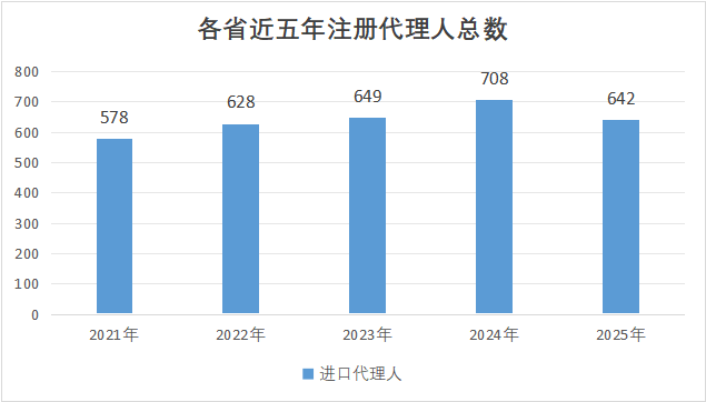 2021-2024年医疗器械进口代理人从578家增长至708家,代理市场处于扩张阶段;2025年数量出现下降,反映出国产替代发展进步,进口市场需求有所收缩。