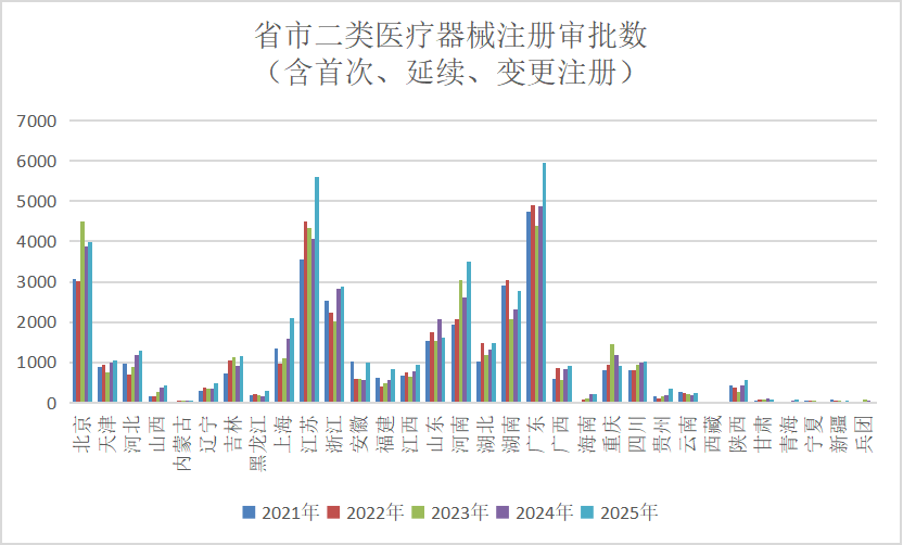 从二类医疗器械区域注册来看,2021-2025年境内二类医疗器械注册审批数呈增长态势,广东、上海、江苏、北京、山东等省份位列前十,成为二类医疗器械市场的核心供给区域。