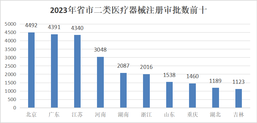 从近五年二类注册审批排名来看,广东和江苏一直位于前两位,归因于强大的制造业基础、相对完善的产业链以及政府对医疗器械行业的大力支持,不仅拥有较多的医疗器械生产企业,且研发能力强,技术创新活跃;北京和河南医疗器械注册审批数量稳定;浙江、湖南和山东医疗器械行业近年来受到较多重视,上海的排名有所波动,但总体保持在前列;湖北、重庆、吉林和安徽等省市注册审批数量和技术表现持续精进。这些省市从一定程度上引领着我国二类医疗器械行业高质量发展,创新活力成效明显。