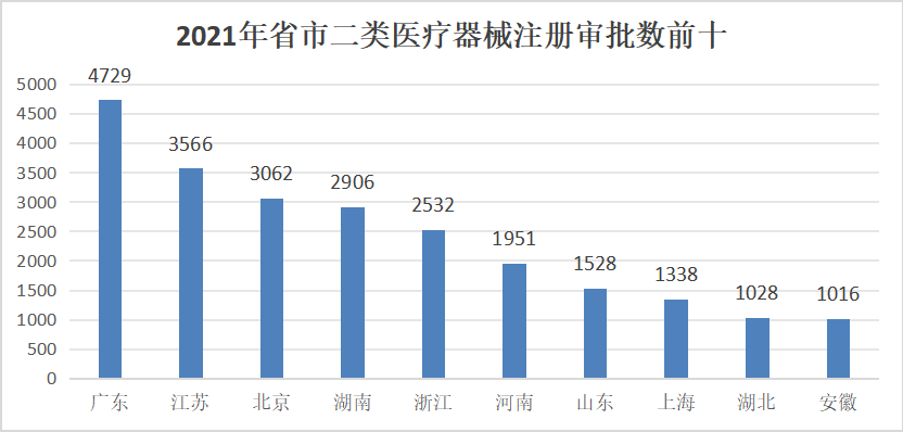 其中,江苏、广东、北京、上海、山东是境内第三类医疗器械首次注册数量排前五名的省份,占2021年境内第三类医疗器械首次注册数量的67.9%,与2020年相比增加4.9%。