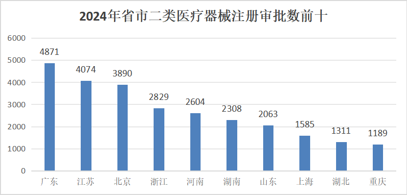 江苏制造业基础雄厚、产业链完整、政策扶持力度大,在体外诊断试剂、高端影像设备、骨科植入物等领域技术能力突出;广东创新生态活跃、临床试验资源丰富、市场转化能力强,在医用机器人、人工智能医疗器械、新型生物材料等方面积累显著优势;浙江民营经济活跃、细分领域专注度高,在医用敷料、低值耗材、胶原蛋白类体外诊断试剂等领域实现差异化发展;北京临床资源密集、科研机构集聚、政策服务精准,在神经和心血管手术器械、高端医学影像设备、创新药械等方面实现协同发展;上海国际化程度高、跨国企业集聚、金融支持完善,在医用机器人、内窥镜、细胞治疗技术等方面优势明显。同时,湖北、河南、湖南、山东等省份注册表现突出,成为承接产业转移、发展特色产业集群的重要力量。