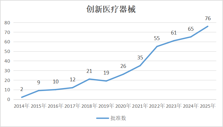 2014年的少量产品,逐步增长至2025年的76个产品获批上市,创新产品供给能力大幅提升,满足人民群众对高水平医疗器械的需求。