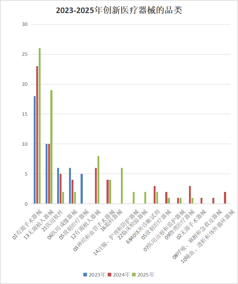 2023-2025年批准的创新医疗器械品种以无源植入器械、有源手术器械、有源植入器械、眼科器械、医用成像器械等高端品类居多,创新方向与产业高端化、智能化发展趋势高度契合。