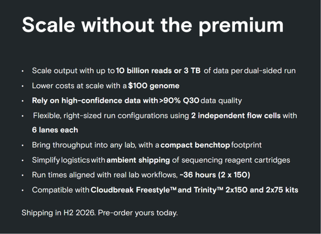 采用双 flow-cell 设计;在PE150测序模式下,单张芯片产出1.5TB数据,单次运行(双芯片)总产出为3TB数据;运行时间约为36小时;测序质量Q30大于90%;可实现100美元人类全基因组测序。预计于2026年下半年开始发货,售价为68.9万美元。