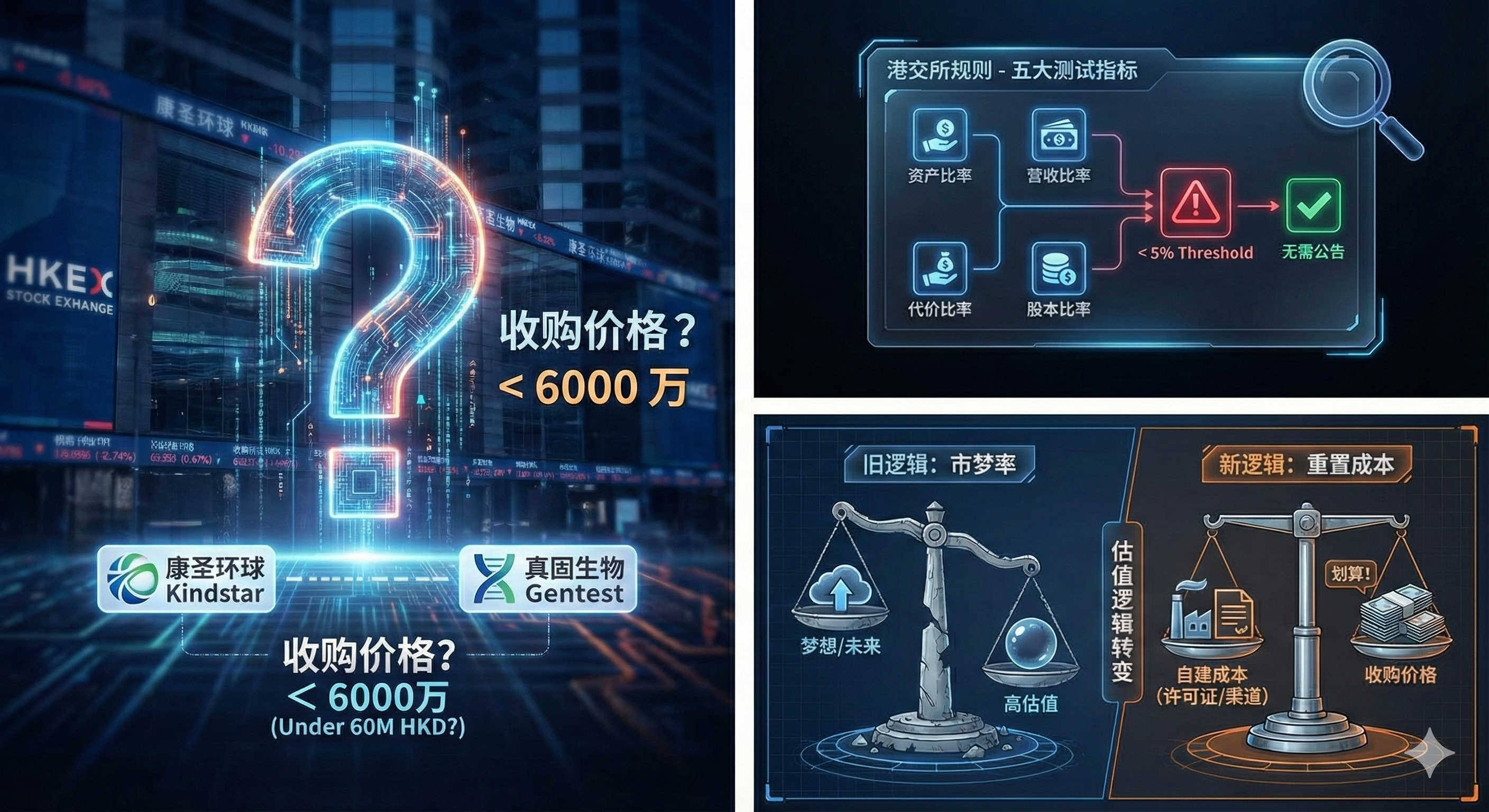 我们还是不够狠心” “骨折,必须骨折”这篇是纠错,纠我们自己的错,我们乐观的高看了行业洗牌局面下的企业价值。今年1月底,康圣环球宣布完成了对真固生物90%股权的收购。当时我们根据港交所的公告规则,推测交易金额不超过5500万人民币,对应真固的估值不超过6200万。而随着今天康圣环球的2025年业绩公告出炉,真相来了。不是6000万,不是5000万,没到4000万,也没有3000万.....康圣环球收购真固生物90%的股权仅用了2050万,对应真固的估值大约是2278万。朋友们,面对现实吧,这就是行业洗牌逻辑下的残酷现实:这种情况下的收购,估值体系就不是既往大家耳熟能详的PE、PS了,因为那都是基于“未来成长空间”的:不管是PS(市销率)还是PE(市盈率),本质都是对公司未来赚钱能力的折现。我自己从头注册一张你持有的三类证、并完成你现有的“额外”渠道铺设,需要花多少钱和多少时间?计算值(自建成本)<拟定收购金额,那毫不犹豫的自己干。最后,虽然真固的“落幕”并不光鲜,但我依然对这家公司怀有敬意:感谢真固在中国肿瘤NGS注册进化史上留下的那浓墨重彩的一笔:增加NRAS的注册变更,让中国肿瘤NGS的注册边界往前又迈进了一大步