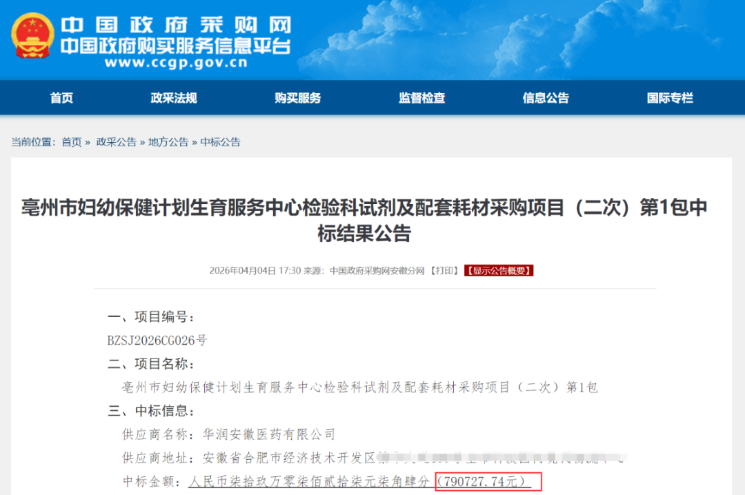 4月4日,中国政府采购网发布《亳州市妇幼保健计划生育服务中心检验科试剂及配套耗材采购项目(二次)第1包中标结果公告》。