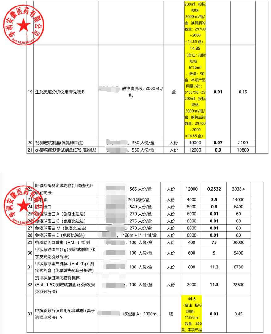 此次中标内容不仅涵盖常规生化、免疫试剂,还打包了整套检验设备及配套耗材。其中,某品牌全自动生化分析仪中标价仅为1500元、600速全自动化学发光免疫分析仪同样为1500元,一套生化免疫流水线系统报价为20000元。