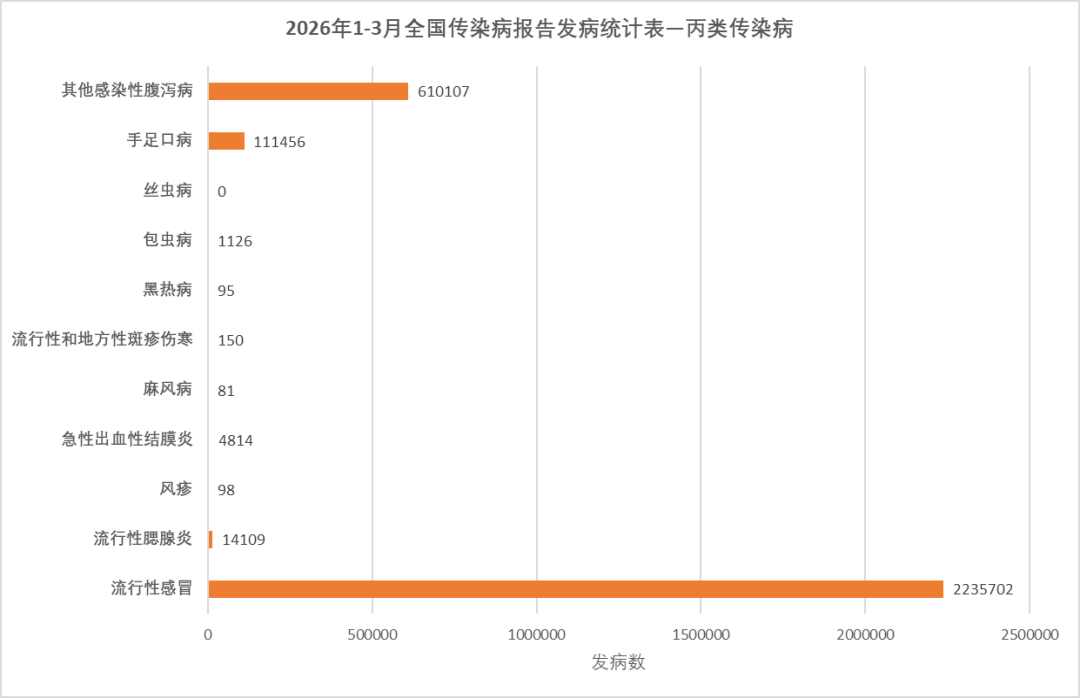 2026 年 1-3 月全国甲乙类传染病共报告发病 836723 例,鼠疫、霍乱、传染性非典型肺炎等多种传染病无病例报告。发病数前 10 的病种如下:梅毒161768例, 肺结核160195例, 乙型肝炎328749例, 新型冠状病毒感染63675例,淋病28252例,布鲁氏菌病12661例,艾滋病10294 例,猩红热5603例,细菌性和阿米巴性痢疾4666例,百日咳2273例。 2026 年 1-3 月全国丙类传染病合计发病 2977738 例,其中流行性感冒发病数最高,达 2235702 例,占比显著;其次为其他感染性腹泻病 610107 例、手足口病 111456 例,为丙类高发传染病。流行性腮腺炎 14109 例,急性出血性结膜炎 4814 例,包虫病 1126 例,其余病种如风疹、黑热病、麻风病发病数均不足 200 例,丝虫病报告数为 0,整体疫情呈集中高发态势,流感、腹泻病为防控重点。 2026 年 1-3 月全国重点监测其他传染病的发病合计发病151576 例。水痘为绝对高发病种,报告 125119 例;其次为肝吸虫病 26334 例,两者为该类疾病的主要构成。低发 / 输入性疾病为发热伴血小板减少综合征、人感染猪链球菌病病例数较少;寨卡病毒病、基孔肯雅热、拉沙热仅为零星个例报告。零发病种:中东呼吸综合征(MERS)、埃博拉出血热报告数为 0,烈性境外传染病无输入流行迹象。 |