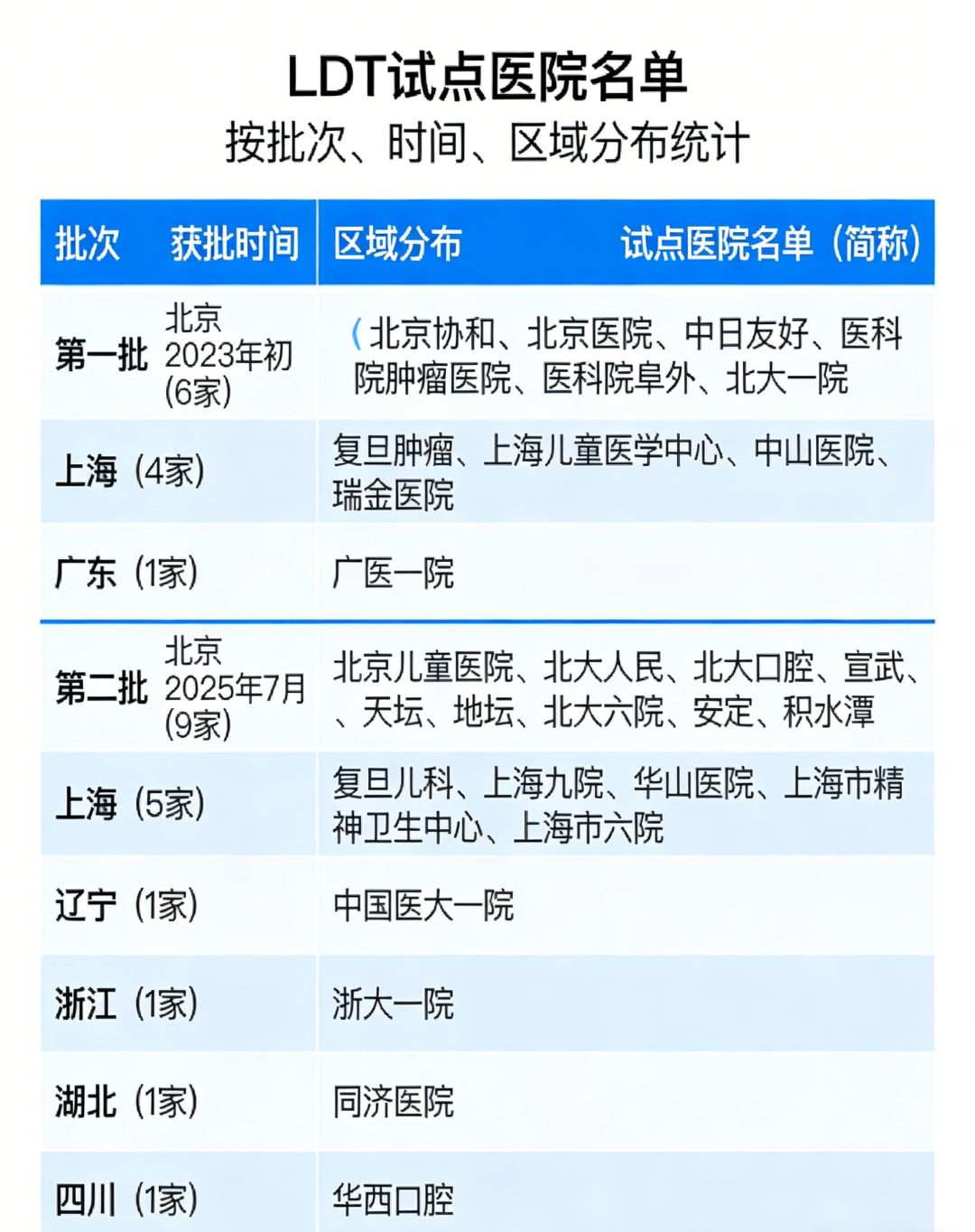 协和的实战时间线堪称教科书级别:2024年,协和作为首批试点完成该试剂院内备案;2025年春季花粉高发期,试剂在临床大规模应用,数月内便积累了7000例真实世界数据。随后,该项目被纳入北京市“春雨行动”重点培育名单,由监管部门全程专人对接。最终,协和科技开发公司作为MAH,委托北京胡曼智造开展规模化生产,首次完整打通了“以真实世界数据替代传统临床试验”的审批闭环。 五、 遍地开花:试点医院LDT项目全景扫描除北京协和外,多家试点医院的LDT标杆项目也已相继落地,覆盖了感染诊疗、儿童精准用药、肿瘤早筛等核心领域: