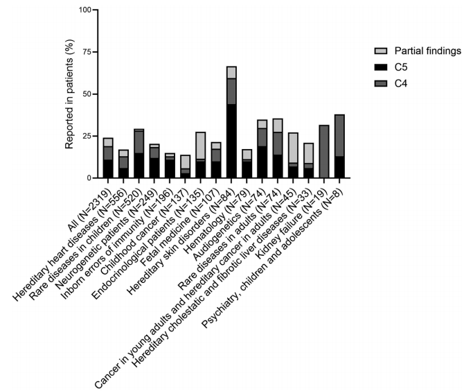 各患者类别中具有解释性发现或部分发现的临床报告所占百分比。图片来源:European Journal of Human Genetics