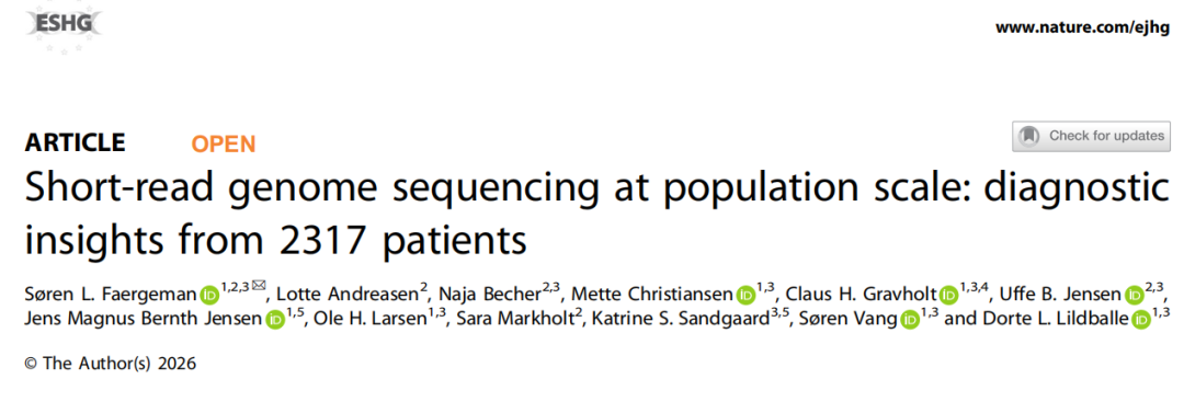 近日,丹麦奥胡斯大学医院在杂志European Journal of Human Genetics 上发表了一篇题为“Short-read genome sequencing at population scale: diagnostic insights from 2317 patients”的文章,本研究纳入了2021至2024年间 2317名疑似单基因病患者,覆盖心血管、儿科罕见病、神经遗传病、免疫缺陷、内分泌、胎儿医学、皮肤遗传病、听力遗传病等多个方向,系统评估了srWGS作为一线诊断工具的大规模落地情况。结果显示,总体诊断率为 20%,但不同疾病类别差异极大,最低为儿童肿瘤患者 6%,最高则可达遗传性皮肤病患者 60%。该研究分析了 15 个患者类别中的诊断率,并为未来诊断策略的设计提供了参考。 图片来源:European Journal of Human Genetics