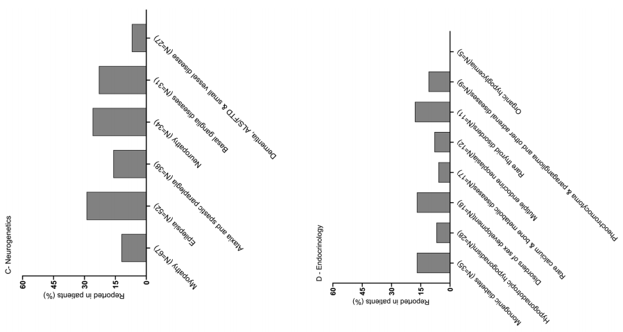 神经遗传病和内分泌患者诊断率可观,但不同亚型内部差异大 神经遗传病是另一个非常值得关注的领域。研究共纳入248例神经遗传患者,总体诊断率为 20%。不同亚型之间有明显差异,癫痫、神经病变、基底节神经疾病等亚组的诊断率较高,约在 23%–28%;肌无力、共济失调、遗传性痉挛性截瘫等亚组相对较低;其中痴呆、ALS/FTD以及小血管病亚组整体只有7%(图 C)。 该研究还纳入了135名内分泌患者,总体诊断率为 12%。在8个内分泌亚组中,部分疾病亚型诊断率接近 18%,例如性发育异常、单基因糖尿病、罕见甲状腺疾病;但另一些亚组,如器质性低血糖,诊断率则接近 0%(图 D)。 特定亚组患者的诊断率。图片来源:European Journal of Human Genetics